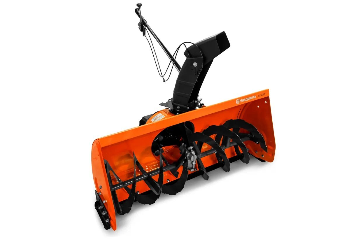 Husqvarna 42" snow blower attachment. Electric lift via one-button operation. After initial mounting brackets and pulley frame brackets are attached, the snow thrower can be removed without tools. Two 12” diameter serrated input augers pull in snow and then the high speed impeller propels the snow thru the poly chute. Replaceable wear plate and skid shoes. Can be raised and lowered from tractor seat. Operator can adjust discharge chute and control deflector pitch and has 180 degree rotation from the tractor seat. Wheel weights and chains recommended. Fits all Husqvarna tractors (2006 & newer models).