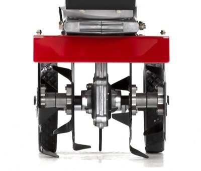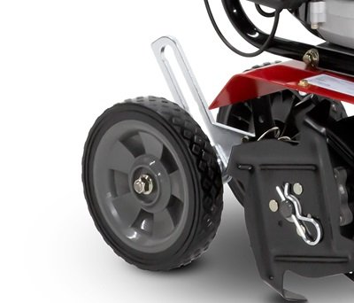 Convenient on-board wheels adjust up and down for easy transport around the garden and provide depth control while cultivating.