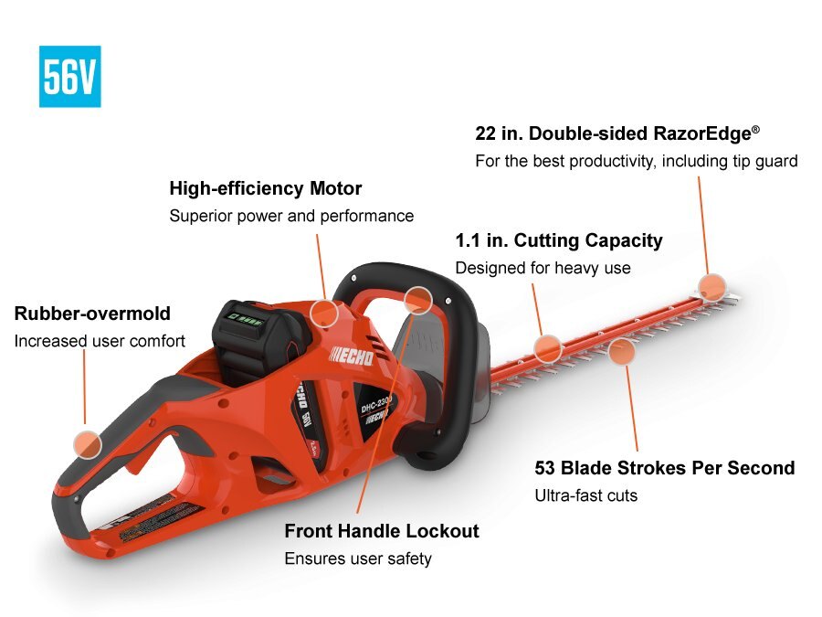 Beauty without bulkiness. The quiet, lightweight DHC-2300 hedge trimmer, powered by the ECHO 56V Battery System, makes precision cuts with a lightning-fast 53 strokes per second, trimming time and effort off the workday.