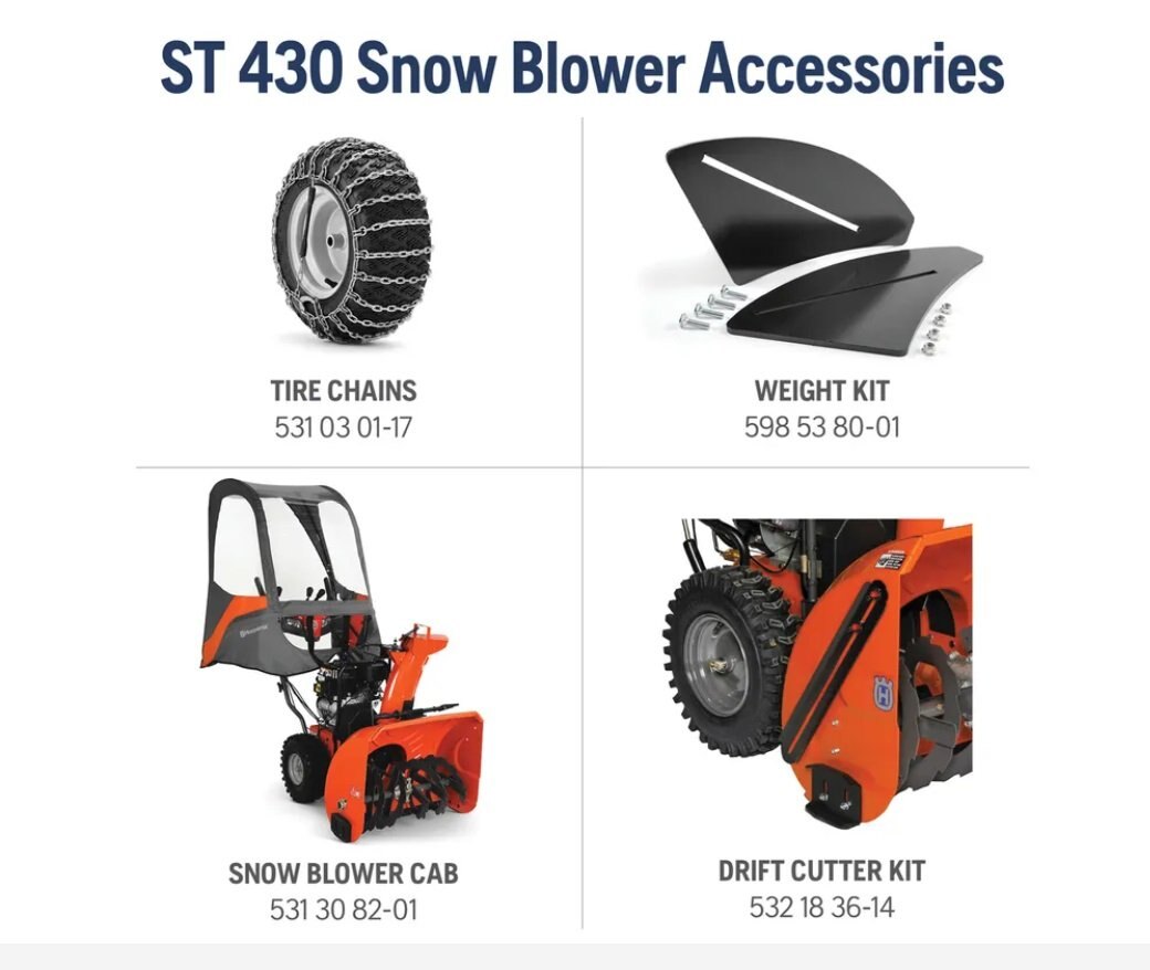 Blaze through winter weather with the Husqvarna ST 430. This commercial-grade snow thrower features a heavy-duty auger and cast iron impeller for maximum performance. With instant key starting and power steering, this machine is easy to use and the heated handle grips will keep you comfortable all winter long. |