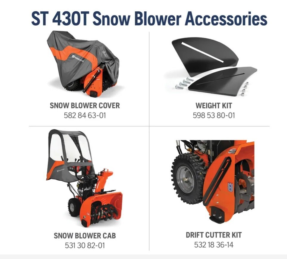 Dominate the toughest winter terrain with the Husqvarna ST 430T. Ultra-rugged tracks stand up to any terrain, day in and day out. This commercial-grade snow thrower features a heavy-duty auger and cast iron impeller for maximum performance. With instant key starting and power steering, this machine is easy to use and the heated handle grips will keep you comfortable all winter long. |